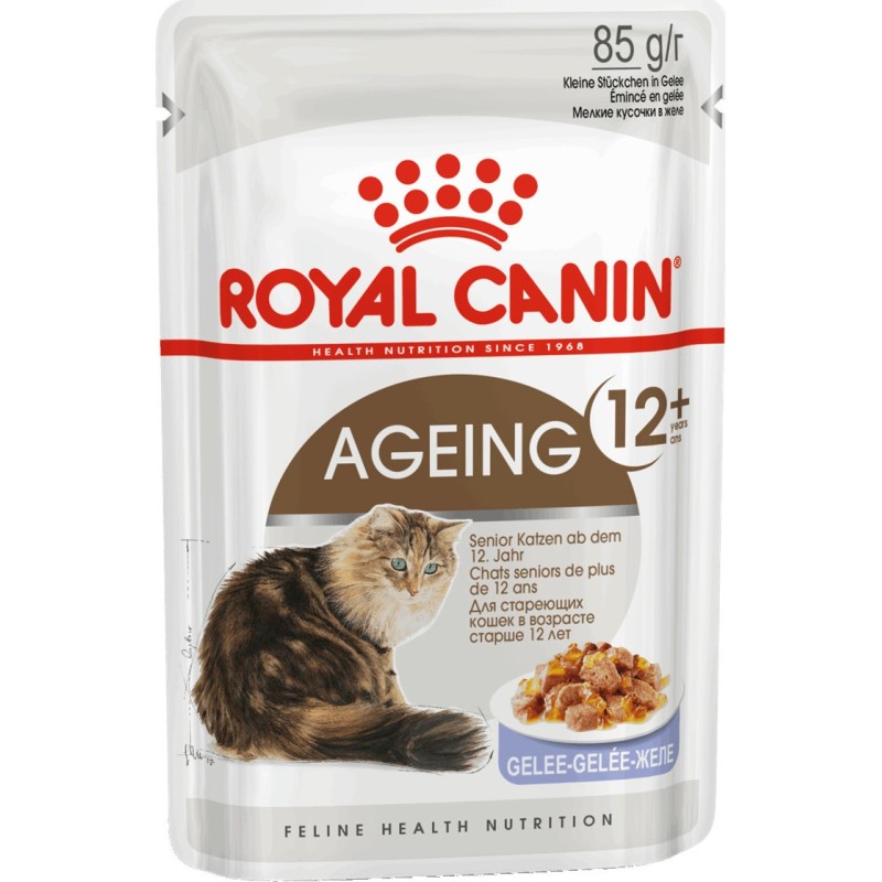 Complete food with chopped slices in sauce for cats over 12 years old.